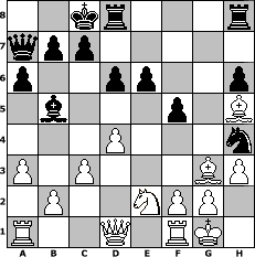 game notation in PGN-format [Event "Weihnachts-Turnier 2006"] [Site "www.myChess.de"] [Date "2006.12.24"] [Round "1"] [White "Andylein1989"] [Black "PublicEnemy"] [ECO "C00"] [WhitemyELO "1398"] [BlackmyELO "1401"] [Result "1-0"] [TimeControl "10/864000"] [WhiteDays "27"] [BlackDays "00"] [MyChessNo "31049"] 1. e4 e6 2. Nf3 Be7 3. d4 Nf6 4. Nc3 d6 5. Bf4 Nc6 6. Bb5 Bd7 7. O-O a6 8. Bd3 h6 9. h3 g5 10. Bh2 Qb8 11. a3 Qa7 12. Be2 O-O-O 13. e5 g4 14. exf6 gxf3 15. fxe7 Nxe7 16. Bxf3 Nf5 17. Ne2 Bb5 18. c3 Nh4 19. Bh5 f5 20. Bg3 1-0 position notation in FEN-format 2kr3r/qpp5/p2pp2p/1b3p1B/3P3n/P1P3BP/1P2NPP1/R2Q1RK1 - - - 1 20 Captured white pieces: Captured black pieces: Click on a captured piece in order to display the desired move!