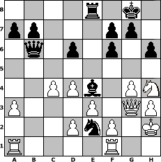 game notation in PGN-format [Event "Arpad Elo Geburtstagstunier"] [Site "www.myChess.de"] [Date "2011.08.23"] [Round "1"] [White "espero"] [Black "muetoe"] [ECO "A45"] [WhitemyELO "1668"] [BlackmyELO "1778"] [Result "0-1"] [TimeControl "10/1728000"] [WhiteDays "20"] [BlackDays "18"] [MyChessNo "75692"] 1. d4 Nf6 2. Bg5 d5 3. Bxf6 exf6 4. e3 Bd6 5. c4 dxc4 6. Bxc4 O-O 7. Nc3 Nc6 8. Nf3 Bg4 9. h3 Bh5 10. Ne4 Re8 11. Nxd6 cxd6 12. O-O Qb6 13. b3 Rac8 14. Rc1 h6 15. g4 Bg6 16. Nh4 Bh7 17. Qf3 Nb4 18. a3 Na2 19. Ra1 Be4 20. Qg3 Nc3 21. Kh2 Rxc4 22. bxc4 Ne2 0-1 position notation in FEN-format 4r1k1/pp3pp1/1q1p1p1p/8/2PPb1PN/P3P1QP/3PnP1K/R4R2 - - - 1 23 Captured white pieces: Captured black pieces: Click on a captured piece in order to display the desired move!