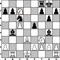 game notation in PGN-format [Event "Clubmeisterschaft der Godzillas 2016"] [Site "www.myChess.de"] [Date "2016.02.15"] [Round "1"] [White "woern63"] [Black "JessicaN"] [ECO "B22"] [WhitemyELO "1994"] [BlackmyELO "1560"] [Result "1-0"] [TimeControl "10/2592000"] [WhiteDays "32"] [BlackDays "00"] [MyChessNo "102531"] 1. e4 c5 2. c3 d5 3. exd5 Qxd5 4. d4 Nf6 5. dxc5 e6 6. b4 Qxd1+ 7. Kxd1 g6 8. Na3 Bg7 9. Nb5 O-O 10. Nc7 Nc6 11. Nxa8 Nd5 12. Bd2 Nxc3+ 13. Bxc3 Bxc3 14. Rb1 Bxb4 15. Nf3 e5 16. Bd3 Bg4 17. Nc7 1-0 position notation in FEN-format 5rk1/ppN2p1p/2n3p1/2P1p3/1b4b1/3B1N2/P3PPPP/1R1K3R - - - 3 17 Captured white pieces: Captured black pieces: Click on a captured piece in order to display the desired move!