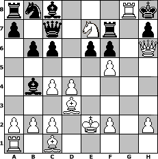 game notation in PGN-format [Event "Schachkreis #2"] [Site "www.myChess.de"] [Date "2018.07.05"] [Round "1"] [White "tiano"] [Black "Steffi"] [ECO "A13"] [WhitemyELO "1561"] [BlackmyELO "1568"] [Result "1-0"] [TimeControl "10/2592000"] [WhiteDays "26"] [BlackDays "28"] [MyChessNo "112515"] 1. c4 e6 2. d4 d5 3. Nf3 Nf6 4. Nc3 c6 5. e3 Bd6 6. Bd3 O-O 7. e4 dxe4 8. Nxe4 b6 9. Nxf6+ gxf6 10. Qd2 f5 11. Qh6 Be7 12. g4 f6 13. gxf5 Rf7 14. Rg1+ Kh8 15. Nh4 Bb4+ 16. Ke2 Qc7 17. Ng6+ Kg8 18. Ne7+ Kh8 19. Rg8# 1-0 position notation in FEN-format rnb3Rk/p1q1Nr1p/1pp1pp1Q/5P2/1bPP4/3B4/PPP1KP1P/R1B5 - - - 12 19 Captured white pieces: Captured black pieces: Click on a captured piece in order to display the desired move!