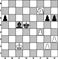 game notation in PGN-format [Event "Neujahrsturnier 2007"] [Site "www.myChess.de"] [Date "2007.01.01"] [Round "1"] [White "bernhard"] [Black "Juliette2103"] [ECO "A06"] [WhitemyELO "1488"] [BlackmyELO "1586"] [Result "1-0"] [TimeControl "10/864000"] [WhiteDays "39"] [BlackDays "00"] [MyChessNo "31292"] 1. Nf3 d5 2. d4 Nf6 3. c4 c6 4. e3 Nbd7 5. c5 g6 6. Bd3 Bg7 7. Nc3 O-O 8. O-O Re8 9. Re1 e5 10. Nxe5 Nxe5 11. dxe5 Rxe5 12. b4 Bd7 13. h3 Ne8 14. Qb3 d4 15. Ne4 dxe3 16. Bxe3 Bf5 17. Rad1 Qc7 18. Ng5 Bxd3 19. Rxd3 Qe7 20. Nf3 Re6 21. Qd1 Nf6 22. Bg5 Rxe1+ 23. Nxe1 Re8 24. Re3 Qd8 25. Qxd8 Rxd8 26. Nd3 h6 27. Bxf6 Bxf6 28. a4 Kf8 29. Kf1 Re8 30. Rxe8+ Kxe8 31. b5 cxb5 32. axb5 Kd7 33. f4 a6 34. bxa6 bxa6 35. Ke2 Kc6 36. Kd2 Bd4 37. Kc2 Bxc5 38. Ne5+ Kd5 39. Nxf7 1-0 position notation in FEN-format 8/5N2/p5pp/2bk4/5P2/7P/2K3P1/8 - - - 0 39 Captured white pieces: Captured black pieces: Click on a captured piece in order to display the desired move!
