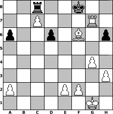 game notation in PGN-format [Event "unter uns Nr. 17"] [Site "www.myChess.de"] [Date "2014.02.13"] [Round "1"] [White "MiFie"] [Black "Caligula"] [ECO "C50"] [WhitemyELO "1072"] [BlackmyELO "1474"] [Result "1-0"] [TimeControl "10/864000"] [WhiteDays "40"] [BlackDays "35"] [MyChessNo "92916"] 1. e4 e5 2. Nf3 Nc6 3. Bc4 d6 4. Nc3 h6 5. O-O Nf6 6. d3 Na5 7. Bb5+ Bd7 8. b4 Nc6 9. h3 Nxb4 10. Ba3 Bxb5 11. Nxb5 Nc6 12. Rb1 a6 13. Nc3 b5 14. Nd5 Nxd5 15. exd5 Ne7 16. c4 Qc8 17. Qc2 f6 18. d4 bxc4 19. Qxc4 Nf5 20. Qc6+ Kf7 21. Qb7 Be7 22. Rfc1 Bd8 23. Rc6 Ke7 24. dxe5 fxe5 25. Nxe5 Qxb7 26. Rxb7 Kf6 27. Bb2 Ke7 28. Ng6+ Kf7 29. Nxh8+ Kg8 30. Ng6 Kh7 31. Nf8+ Kg8 32. Ne6 Ne7 33. Nxd8 Rxd8 34. Rbxc7 Nxc6 35. Rxg7+ Kf8 36. dxc6 Rc8 37. c7 Ke8 38. Bf6 Kf8 39. g4 1-0 position notation in FEN-format 2r2k2/2P3R1/p2p1B1p/8/6P1/7P/P3PP2/6K1 - - - 0 39 Captured white pieces: Captured black pieces: Click on a captured piece in order to display the desired move!