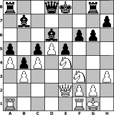 game notation in PGN-format [Event "Eine Chance f"] [Site "www.myChess.de"] [Date "2008.08.01"] [Round "1"] [White "Fussel"] [Black "Helmut48"] [ECO "C41"] [WhitemyELO "1324"] [BlackmyELO "1409"] [Result "1/2-1/2"] [TimeControl "10/1728000"] [WhiteDays "13"] [BlackDays "20"] [MyChessNo "46757"] 1. e4 e5 2. Nf3 d6 3. Bc4 f6 4. h3 a6 5. d4 b5 6. Bxg8 Rxg8 7. d5 g6 8. b3 Nd7 9. Be3 Nc5 10. Nbd2 Bb7 11. Bxc5 dxc5 12. c4 b4 13. a4 a5 14. O-O c6 15. Qe2 cxd5 16. exd5 Bd6 17. Ne4 1/2-1/2 position notation in FEN-format r2qk1r1/1b5p/3b1pp1/p1pPp3/PpP1N3/1P3N1P/4QPP1/R4RK1 - q - 2 17 Captured white pieces: ![]() ![]() ![]() ![]() ![]() ![]() ![]() ![]() ![]() ![]() ![]() ![]() ![]() ![]() ![]() Captured black pieces: ![]() ![]() ![]() ![]() ![]() ![]() ![]() ![]() ![]() ![]() ![]() ![]() ![]() ![]() ![]() Click on a captured piece in order to display the desired move!