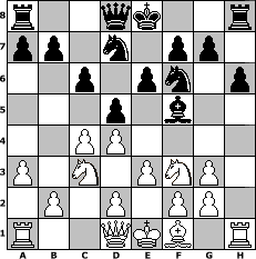 game notation in PGN-format [Event "Für die kalten Tage..."] [Site "www.myChess.de"] [Date "2018.02.09"] [Round "2"] [White "FrankB"] [Black "freizeitspieler"] [ECO "A46"] [WhitemyELO "1706"] [BlackmyELO "1532"] [Result "0-1"] [TimeControl "10/1728000"] [WhiteDays "00"] [BlackDays "20"] [MyChessNo "111369"] 1. d4 Nf6 2. Nf3 d5 3. Bf4 Bf5 4. e3 e6 5. a3 Bd6 6. Bg3 Bxg3 7. hxg3 Nbd7 8. c4 c6 9. Nc3 h6 0-1 position notation in FEN-format r2qk2r/pp1n1pp1/2p1pn1p/3p1b2/2PP4/P1N1PNP1/1P1P1PP1/R2QKB1R - KQkq - 0 10 Captured white pieces: Captured black pieces: Click on a captured piece in order to display the desired move!