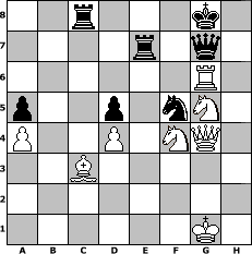 game notation in PGN-format [Event "2016"] [Site "www.myChess.de"] [Date "2016.01.01"] [Round "1"] [White "muetoe"] [Black "Helmut48"] [ECO "B52"] [WhitemyELO "1916"] [BlackmyELO "1965"] [Result "1-0"] [TimeControl "10/2592000"] [WhiteDays "30"] [BlackDays "30"] [MyChessNo "101939"] 1. e4 c5 2. Nf3 d6 3. Bb5+ Bd7 4. Bxd7+ Qxd7 5. O-O Nc6 6. c3 Nf6 7. d4 cxd4 8. cxd4 d5 9. e5 Ng8 10. Na3 e6 11. Nc2 Nge7 12. Bd2 a5 13. Ne3 Ng6 14. h4 h5 15. g3 Be7 16. Nc2 Qc7 17. a4 Qb6 18. Bc3 Rc8 19. Kg2 Qa6 20. Rh1 Bd8 21. Rc1 Be7 22. Ne3 Bd8 23. Rc2 Rc7 24. Qd2 Rd7 25. Ra1 O-O 26. Rb1 f6 27. exf6 Bxf6 28. Qe2 Qb6 29. Qd3 Nge7 30. Kg1 Rd6 31. Re2 Nb4 32. Qd2 Nbc6 33. Ng2 Nf5 34. Rd1 g6 35. Nf4 Kf7 36. Rde1 Re8 37. Nd3 Qc7 38. Kg2 Qb6 39. b3 Qxb3 40. Nc5 Qb6 41. Ng5+ Kg8 42. Ngxe6 Rc8 43. f3 Qa7 44. Qf4 b6 45. g4 hxg4 46. fxg4 Nxh4+ 47. Kh1 Qe7 48. g5 Nf5 49. gxf6 Qxf6 50. Ng5 Rdd8 51. Nce6 Rd7 52. Kg1 Re7 53. Qg4 Rd7 54. Nf4 Nce7 55. Re6 Qg7 56. Rxb6 Ra7 57. Rxe7 Rxe7 58. Rxg6 1-0 position notation in FEN-format 2r3k1/4r1q1/6R1/p2p1nN1/P2P1NQ1/2B5/8/6K1 - - - 0 58 Captured white pieces: Captured black pieces: Click on a captured piece in order to display the desired move!