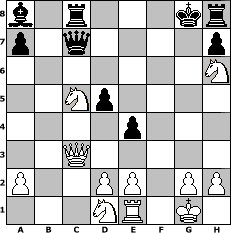 game notation in PGN-format [Event "1.MySchach-960-Cup 2015"] [Site "www.myChess.de"] [Date "2015.10.07"] [Round "1"] [White "Peterlie77 (C)"] [Black "espero"] [Variant "Fischerrandom"] [SetUp "1"] [FEN "bbqnnrkr/pppppppp/8/8/8/8/PPPPPPPP/BBQNNRKR w KQkq - 0 1"] [WhitemyELO "2084"] [BlackmyELO "2053"] [Result "1-0"] [TimeControl "10/1728000"] [WhiteDays "20"] [BlackDays "19"] [MyChessNo "100699"] 1. Ne3 e6 2. b4 b6 3. Nd3 c5 4. bxc5 bxc5 5. c4 f5 6. Qa3 d6 7. Bc2 Nf6 8. Rb1 Nc6 9. O-O Nd4 10. Re1 Ne4 11. Qc1 Qd8 12. f3 d5 13. cxd5 exd5 14. fxe4 fxe4 15. Rxb8 Qxb8 16. Nxc5 Nxc2 17. Qxc2 Rc8 18. Bxg7 Kxg7 19. Qc3+ Kg8 20. Nf5 Qc7 21. Nh6+ 1-0 position notation in FEN-format b1r3kr/p1q4p/7N/2Np4/4p3/2Q5/P2PP1PP/3NR1K1 - - - 5 21 Captured white pieces: Captured black pieces: Click on a captured piece in order to display the desired move!