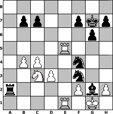 game notation in PGN-format [Event "?"] [Site "www.myChess.de"] [Date "2023.11.22"] [Round "?"] [White "faustballer"] [Black "pillepalle"] [ECO "C42"] [WhitemyELO "1499"] [BlackmyELO "2036"] [Result "0-1"] [TimeControl "10/1728000"] [WhiteDays "60"] [BlackDays "55"] [MyChessNo "131103"] 1. e4 e5 2. Nf3 Nf6 3. d3 Nc6 4. a3 d5 5. exd5 Nxd5 6. Be2 g6 7. b4 Bg7 8. Bb2 O-O 9. O-O e4 10. Bxg7 exf3 11. Bxf8 fxe2 12. Qxe2 Kxf8 13. Nd2 a5 14. c4 Nf4 15. Qe3 Nd4 16. Rae1 Qg5 17. Qe8+ Kg7 18. Qe5+ Qxe5 19. Rxe5 axb4 20. axb4 Ra2 21. Ne4 Bh3 22. Nc3 Bxg2 23. Rfe1 Nf3# 0-1 position notation in FEN-format 8/1pp2pkp/6p1/4R3/1PP2n2/2NP1n2/r4PbP/4R1K1 - - - 2 24 Captured white pieces: Captured black pieces: Click on a captured piece in order to display the desired move!