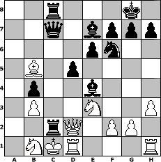 game notation in PGN-format [Event "Fr"] [Site "www.myChess.de"] [Date "2005.04.22"] [Round "1"] [White "Tommy6"] [Black "JerryWho"] [ECO "B55"] [WhitemyELO "1564"] [BlackmyELO "1568"] [Result "0-1"] [TimeControl "10/1728000"] [WhiteDays "50"] [BlackDays "53"] [MyChessNo "12279"] 1. e4 c5 2. Nf3 d6 3. d4 cxd4 4. Nxd4 Nf6 5. Bd3 e6 6. Nf3 Be7 7. b3 O-O 8. Bb2 Nc6 9. Nc3 a6 10. h3 Qc7 11. Qe2 b5 12. a3 Bb7 13. O-O-O b4 14. Nb1 bxa3 15. Bxa3 a5 16. Bb5 Rfc8 17. Qd3 Nb4 18. Bxb4 axb4 19. Nfd2 Ra2 20. Nc4 Bxe4 21. Qd2 d5 22. Ne3 Rxc2+ 0-1 position notation in FEN-format 2r3k1/2q1bppp/4pn2/1B1p4/1p2b3/1P2N2P/2rQ1PP1/1NKR3R - - - 0 23 Captured white pieces: ![]() ![]() ![]() ![]() ![]() ![]() ![]() ![]() ![]() ![]() ![]() ![]() ![]() ![]() ![]() Captured black pieces: ![]() ![]() ![]() ![]() ![]() ![]() ![]() ![]() ![]() ![]() ![]() ![]() ![]() ![]() ![]() Click on a captured piece in order to display the desired move!