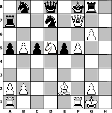game notation in PGN-format [Event "Drachenboote auf dem Rhein"] [Site "www.myChess.de"] [Date "2009.07.15"] [Round "1"] [White "Jolilein"] [Black "hape50"] [ECO "B01"] [WhitemyELO "1802"] [BlackmyELO "1384"] [Result "1-0"] [TimeControl "10/1728000"] [WhiteDays "20"] [BlackDays "20"] [MyChessNo "57485"] 1. e4 d5 2. exd5 Nf6 3. c4 c6 4. d4 e6 5. dxe6 Bxe6 6. Nf3 h6 7. Ne5 Bd6 8. Be2 O-O 9. O-O a6 10. Bf4 Bxe5 11. dxe5 Nfd7 12. Qb3 b5 13. Qg3 g5 14. Be3 c5 15. f4 f6 16. cxb5 a5 17. f5 Bd5 18. Nc3 fxe5 19. Nxd5 Ra7 20. h4 Kh7 21. hxg5 Rg8 22. g6+ Kg7 23. Bxh6+ Kxh6 24. Qh3+ Kg7 25. Qh7+ Kf8 26. Qf7# 1-0 position notation in FEN-format 1n1q1kr1/r2n1Q2/6P1/pPpNpP2/8/8/PP2B1P1/R4RK1 - - - 5 26 Captured white pieces: Captured black pieces: Click on a captured piece in order to display the desired move!