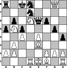 game notation in PGN-format [Event "1.Chess in Friendship"] [Site "www.myChess.de"] [Date "2004.08.10"] [Round "2"] [White "Tarot"] [Black "OwainGwynedd"] [ECO "A01"] [WhitemyELO "1829"] [BlackmyELO "1263"] [Result "1-0"] [TimeControl "10/2592000"] [WhiteDays "89"] [BlackDays "88"] [MyChessNo "6117"] 1. b3 e6 2. e4 d6 3. d4 f6 4. Nf3 b6 5. c4 g5 6. d5 Bg7 7. dxe6 Bxe6 8. Nd4 h5 9. Nxe6 Qe7 10. Qd5 c6 11. Qf5 Nh6 12. Qg6+ Kd7 13. Qxg7 Rh7 14. Qxh7 Nf7 15. Nd4 h4 16. Nc3 a5 17. Nf5 Qe6 18. Be3 c5 19. Rd1 Kc8 20. Nb5 Nd7 21. Qg8+ Nd8 22. Nfxd6+ 1-0 position notation in FEN-format r1kn2Q1/3n4/1p1Nqp2/pNp3p1/2P1P2p/1P2B3/PP3PPP/3RKB1R - K - 0 22 Captured white pieces: Captured black pieces: Click on a captured piece in order to display the desired move!
