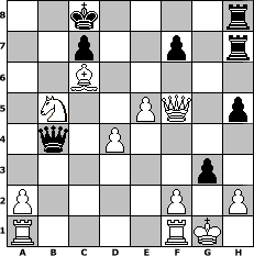 game notation in PGN-format [Event "YOUR LAST BREATH"] [Site "www.myChess.de"] [Date "2019.11.17"] [Round "2"] [White "augustus"] [Black "skuehnel"] [ECO "B02"] [WhitemyELO "1155"] [BlackmyELO "1291"] [Result "1-0"] [TimeControl "10/3456000"] [WhiteDays "40"] [BlackDays "39"] [MyChessNo "116358"] 1. e4 Nf6 2. d3 e5 3. Bg5 d6 4. Be2 h6 5. Bxf6 Qxf6 6. Nh3 Nc6 7. c3 Bxh3 8. gxh3 O-O-O 9. b4 Be7 10. Bg4+ Kb8 11. O-O Rh7 12. Nd2 Rdh8 13. Be2 Qh4 14. Bg4 h5 15. Bd7 g5 16. Bxc6 Qxh3 17. Nc4 d5 18. Bxd5 b5 19. Nxe5 Bd6 20. d4 g4 21. Nc6+ Kc8 22. Nxa7+ Kd7 23. Bc6+ Kd8 24. e5 Bxb4 25. cxb4 Qa3 26. Nxb5 Qxb4 27. Qc1 g3 28. Qg5+ Kc8 29. Qf5+ 1-0 position notation in FEN-format 2k4r/2p2p1r/2B5/1N2PQ1p/1q1P4/6p1/P4P1P/R4RK1 - - - 3 29 Captured white pieces: Captured black pieces: Click on a captured piece in order to display the desired move!