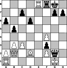 game notation in PGN-format [Event "Ostern 2017"] [Site "www.myChess.de"] [Date "2017.04.17"] [Round "1"] [White "Joschi"] [Black "Cuibono"] [ECO "C91"] [WhitemyELO "1579"] [BlackmyELO "2189"] [Result "0-1"] [TimeControl "10/2592000"] [WhiteDays "90"] [BlackDays "89"] [MyChessNo "107859"] 1. e4 e5 2. Nf3 Nc6 3. Bb5 a6 4. Ba4 Nf6 5. O-O Be7 6. Re1 b5 7. Bb3 d6 8. c3 O-O 9. d4 Bg4 10. dxe5 Nxe5 11. Nbd2 Nfd7 12. Qe2 Bg5 13. h3 Bxd2 14. Bxd2 Nxf3+ 15. gxf3 Bh5 16. Qe3 Ne5 17. Bd1 Nc4 18. Qd3 Qh4 19. Kg2 Rae8 20. b3 Nb2 21. Qc2 f5 22. Qxb2 fxe4 23. f4 Bf3+ 24. Kg1 Qxh3 25. Bxf3 exf3 26. Rxe8 Qg2# 0-1 position notation in FEN-format 4Rrk1/2p3pp/p2p4/1p6/5P2/1PP2p2/PQ1B1Pq1/R5K1 - - - 1 27 Captured white pieces: Captured black pieces: Click on a captured piece in order to display the desired move!