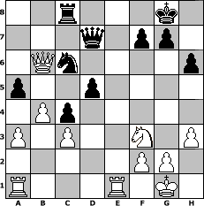 game notation in PGN-format [Event "2010 wird gut!"] [Site "www.myChess.de"] [Date "2010.01.08"] [Round "1"] [White "Tomino"] [Black "nogumo"] [ECO "A46"] [WhitemyELO "1744"] [BlackmyELO "1602"] [Result "1-0"] [TimeControl "10/864000"] [WhiteDays "07"] [BlackDays "06"] [MyChessNo "62175"] 1. d4 Nf6 2. Nf3 e6 3. Bf4 b6 4. e3 Bb7 5. Bd3 Be7 6. h3 O-O 7. Nbd2 c5 8. c3 h6 9. O-O d5 10. a3 Ba6 11. Bxa6 Nxa6 12. Qa4 Nc7 13. Ne5 Bd6 14. dxc5 Bxe5 15. Bxe5 bxc5 16. b4 Nd7 17. Bd6 Nb6 18. Qc6 Na6 19. Bxf8 Qxf8 20. Qb5 Qc8 21. e4 c4 22. Qa5 Nb8 23. exd5 exd5 24. Nf3 Nc6 25. Qc5 Qd7 26. Rfe1 Rc8 27. Qe3 a5 28. Qxb6 1-0 position notation in FEN-format 2r3k1/3q1pp1/1Qn4p/p2p4/1Pp5/P1P2N1P/5PP1/R3R1K1 - - - 0 28 Captured white pieces: Captured black pieces: Click on a captured piece in order to display the desired move!