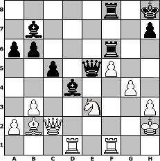 game notation in PGN-format [Event "M"] [Site "www.myChess.de"] [Date "2013.09.19"] [Round "1"] [White "FrankB"] [Black "espero"] [ECO "A46"] [WhitemyELO "1650"] [BlackmyELO "1714"] [Result "0-1"] [TimeControl "10/3456000"] [WhiteDays "38"] [BlackDays "40"] [MyChessNo "90313"] 1. d4 Nf6 2. Nf3 c5 3. e3 g6 4. Be2 Bg7 5. O-O b6 6. c4 O-O 7. Nc3 d6 8. h3 Bb7 9. Qc2 Nbd7 10. Rd1 Rc8 11. d5 a6 12. Rb1 Ne8 13. e4 Ne5 14. Nd2 Nc7 15. f4 Nd7 16. b3 e5 17. dxe6 fxe6 18. g3 Bd4+ 19. Kh2 Nf6 20. Bb2 e5 21. f5 gxf5 22. exf5 d5 23. cxd5 Ncxd5 24. Nxd5 Nxd5 25. Bc4 Kh8 26. Bxd5 Qxd5 27. Nc4 Rc6 28. Rf1 e4 29. Rbd1 Rcf6 30. g4 e3 31. Nxe3 Qe5+ 0-1 position notation in FEN-format 5r1k/1b5p/pp3r2/2p1qP2/3b2P1/1P2N2P/PBQ4K/3R1R2 - - - 1 32 Captured white pieces: Captured black pieces: Click on a captured piece in order to display the desired move!