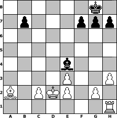 game notation in PGN-format [Event "K"] [Site "www.myChess.de"] [Date "2004.04.28"] [Round "1"] [White "Juri"] [Black "Knight"] [ECO "C24"] [WhitemyELO "1453"] [BlackmyELO "1478"] [Result "1-0"] [TimeControl "10/3456000"] [WhiteDays "120"] [BlackDays "120"] [MyChessNo "4194"] 1. e4 e5 2. Bc4 Nf6 3. d3 Bc5 4. h3 O-O 5. Nf3 d5 6. exd5 e4 7. dxe4 Nxe4 8. Be3 Bxe3 9. fxe3 Re8 10. Qd4 c5 11. dxc6 Nxc6 12. Qxd8 Rxd8 13. Nbd2 Nxd2 14. Nxd2 Ne5 15. O-O-O a5 16. Bb5 Be6 17. Kb1 a4 18. Ne4 a3 19. bxa3 Rd5 20. Rxd5 Bxd5 21. Bd3 Rxa3 22. Kc1 Rxa2 23. Kd2 Nc4+ 24. Bxc4 Bxe4 25. Bxa2 1-0 position notation in FEN-format 6k1/1p3ppp/8/8/4b3/4P2P/B1PKP1P1/7R - - - 0 25 Captured white pieces: ![]() ![]() ![]() ![]() ![]() ![]() ![]() ![]() ![]() ![]() ![]() ![]() ![]() ![]() ![]() Captured black pieces: ![]() ![]() ![]() ![]() ![]() ![]() ![]() ![]() ![]() ![]() ![]() ![]() ![]() ![]() ![]() Click on a captured piece in order to display the desired move!