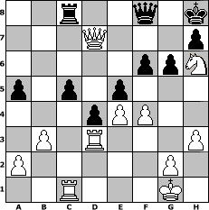 game notation in PGN-format [Event "Verschachert #10"] [Site "www.myChess.de"] [Date "2016.10.30"] [Round "2"] [White "Macks"] [Black "beowulf"] [ECO "D06"] [WhitemyELO "1460"] [BlackmyELO "1317"] [Result "1-0"] [TimeControl "10/2592000"] [WhiteDays "26"] [BlackDays "30"] [MyChessNo "105475"] 1. d4 d5 2. c4 Nf6 3. cxd5 Qxd5 4. Nc3 Qd8 5. Nf3 Nc6 6. e4 Bg4 7. Bb5 a6 8. Bxc6+ bxc6 9. O-O e6 10. Bg5 Be7 11. Qd3 O-O 12. Ne5 Qd6 13. Bxf6 Bxf6 14. Nxg4 Bxd4 15. Rad1 c5 16. Rd2 Rfd8 17. Ne2 e5 18. Nxd4 cxd4 19. h3 f6 20. Qg3 Rd7 21. Rd3 c5 22. Nh6+ Kh8 23. Nf5 Qe6 24. b3 a5 25. Rc1 g6 26. Nh6 Rc8 27. Qg4 Qe8 28. f4 Qf8 29. Qxd7 1-0 position notation in FEN-format 2r2q1k/3Q3p/5ppN/p1p1p3/3pPP2/1P1R3P/P5P1/2R3K1 - - - 0 29 Captured white pieces: Captured black pieces: Click on a captured piece in order to display the desired move!