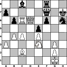 game notation in PGN-format [Event "2.Clubmeisterschaft 2011/12- A-Finale"] [Site "www.myChess.de"] [Date "2012.02.05"] [Round "1"] [White "leitsgeheier"] [Black "BobbyF4"] [ECO "A40"] [WhitemyELO "1671"] [BlackmyELO "1533"] [Result "1-0"] [TimeControl "10/2592000"] [WhiteDays "72"] [BlackDays "00"] [MyChessNo "79669"] 1. d4 e6 2. c4 d6 3. Nf3 c6 4. e4 b6 5. Nc3 Nd7 6. Bd3 g6 7. O-O Bg7 8. Bf4 e5 9. dxe5 dxe5 10. Bg3 Qe7 11. h3 Nh6 12. Re1 Nc5 13. Bc2 Bb7 14. Qe2 O-O 15. Rad1 f6 16. Rd2 Nf7 17. b4 Ne6 18. a3 Rad8 19. Red1 Rxd2 20. Rxd2 g5 21. Nd1 Nf4 22. Qf1 h5 23. Ne3 Nh6 24. Qd1 Bc8 25. Rd6 Nf7 26. Rd2 g4 27. hxg4 hxg4 28. Nh2 Nh5 29. Nhxg4 Nxg3 30. fxg3 Bh6 31. Nxh6+ Nxh6 32. Rd6 Qf7 33. Rxc6 Kh7 34. Qd6 1-0 position notation in FEN-format 2b2r2/p4q1k/1pRQ1p1n/4p3/1PP1P3/P3N1P1/2B3P1/6K1 - - - 2 34 Captured white pieces: Captured black pieces: Click on a captured piece in order to display the desired move!
