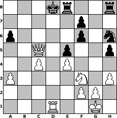 game notation in PGN-format [Event "Godzilla Mannschaftsturnier 2013"] [Site "www.myChess.de"] [Date "2013.08.15"] [Round "1"] [Board "5"] [White "Wulfen49"] [Black "alpacino"] [ECO "C41"] [WhitemyELO "1283"] [BlackmyELO "1387"] [Result "1-0"] [TimeControl "10/3456000"] [WhiteDays "40"] [BlackDays "38"] [MyChessNo "89750"] 1. e4 e5 2. Nf3 d6 3. d4 Nc6 4. Bb5 Bd7 5. d5 Nb4 6. Bxd7+ Qxd7 7. O-O O-O-O 8. a3 Na6 9. Nc3 Be7 10. Qd3 Nc5 11. Qe3 h6 12. b4 Nf6 13. Nd2 Ng4 14. Qe2 h5 15. bxc5 dxc5 16. Nb5 Kb8 17. c4 c6 18. dxc6 Qxc6 19. Nf3 Bf6 20. Bg5 a6 21. Bxf6 gxf6 22. Nc3 Ka8 23. Nd5 Rde8 24. Rab1 Kb8 25. h3 Nh6 26. Rb6 Qc8 27. Rfb1 Ka8 28. Rxa6+ bxa6 29. Nb6+ Kb8 30. Nxc8+ Kxc8 31. Qb2 Kd8 32. Qb6+ Ke7 33. Qxc5+ Kd8 34. Rd1# 1-0 position notation in FEN-format 3kr2r/5p2/p4p1n/2Q1p2p/2P1P3/P4N1P/5PP1/3R2K1 - - - 2 34 Captured white pieces: Captured black pieces: Click on a captured piece in order to display the desired move!