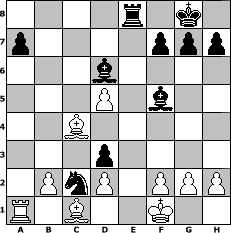 game notation in PGN-format [Event "Gewitter im August"] [Site "www.myChess.de"] [Date "2006.08.13"] [Round "1"] [White "Andreas"] [Black "zoli"] [ECO "C42"] [WhitemyELO "1682"] [BlackmyELO "1603"] [Result "0-1"] [TimeControl "10/864000"] [WhiteDays "27"] [BlackDays "29"] [MyChessNo "27657"] 1. e4 e5 2. Nf3 Nf6 3. Nxe5 Qe7 4. Nf3 Qxe4+ 5. Qe2 Qxe2+ 6. Bxe2 d5 7. O-O Bd6 8. Bb5+ c6 9. Re1+ Be6 10. Ba4 O-O 11. Nd4 Bd7 12. Nc3 b5 13. Bb3 b4 14. Nce2 c5 15. c4 cxd4 16. cxd5 d3 17. Ng3 Rc8 18. a3 Na6 19. axb4 Nxb4 20. Ne4 Nxe4 21. Rxe4 Bf5 22. Rc4 Rxc4 23. Bxc4 Re8 24. Kf1 Nc2 0-1 position notation in FEN-format 4r1k1/p4ppp/3b4/3P1b2/2B5/3p4/1PnP1PPP/R1B2K2 - - - 3 25 Captured white pieces: Captured black pieces: Click on a captured piece in order to display the desired move!