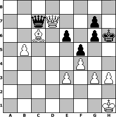 game notation in PGN-format [Event "Adventszeit"] [Site "www.myChess.de"] [Date "2022.11.28"] [Round "1"] [White "Seneca"] [Black "borsti"] [ECO "D00"] [WhitemyELO "1503"] [BlackmyELO "1402"] [Result "1-0"] [TimeControl "10/1728000"] [WhiteDays "19"] [BlackDays "20"] [MyChessNo "128281"] 1. d4 d5 2. e3 a6 3. c4 dxc4 4. Bxc4 Nf6 5. Nc3 Bg4 6. f3 Bh5 7. Nh3 e6 8. Nf4 Bg6 9. Nxg6 hxg6 10. h3 Bd6 11. O-O c6 12. a3 Nbd7 13. b4 Nb6 14. Bd3 a5 15. b5 c5 16. Ne4 Nh5 17. dxc5 Bxc5 18. Nxc5 Qc7 19. Ne4 O-O 20. a4 Rfd8 21. Qe2 Ng3 22. Nxg3 Qxg3 23. Be4 Rac8 24. Bxb7 Rc7 25. Bc6 Rd6 26. Bd2 Ra7 27. Be1 Qe5 28. Ra2 Rc7 29. Rd2 Nxa4 30. Rxd6 Qxd6 31. Bxa5 Ra7 32. Bd2 Nc5 33. Bb4 Qe5 34. Bxc5 Qxc5 35. Kh1 Qe5 36. Rd1 f5 37. f4 Qc7 38. Rd7 Qb8 39. Rxa7 Qxa7 40. Qd3 Kh7 41. Qd4 Qc7 42. g3 Kh6 43. Qd7 1-0 position notation in FEN-format 8/2qQ2p1/2B1p1pk/1P3p2/5P2/4P1PP/8/7K - - - 2 43 Captured white pieces: Captured black pieces: Click on a captured piece in order to display the desired move!