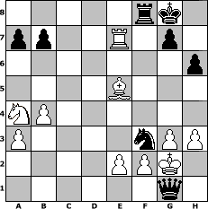 game notation in PGN-format [Event "Turnier zum Tag der deutschen Einheit"] [Site "www.myChess.de"] [Date "2010.10.04"] [Round "1"] [White "Hobbykegler"] [Black "hape50"] [ECO "C41"] [WhitemyELO "1133"] [BlackmyELO "1341"] [Result "0-1"] [TimeControl "10/1728000"] [WhiteDays "33"] [BlackDays "60"] [MyChessNo "68783"] 1. e4 e5 2. Nf3 d6 3. Bc4 c6 4. Nc3 Nf6 5. O-O h6 6. h3 d5 7. exd5 Bd6 8. Re1 O-O 9. dxc6 Nxc6 10. d4 Nxd4 11. Nxe5 Bxe5 12. Rxe5 Be6 13. Bxe6 fxe6 14. Qd3 Qd6 15. Bf4 Qb4 16. a3 Qb6 17. b4 Rad8 18. Na4 Qc7 19. g3 Nxc2 20. Rc1 Rxd3 21. Rxe6 Qd7 22. Re5 Rd1+ 23. Rxd1 Qxd1+ 24. Kg2 Nd7 25. Re7 Ne1+ 26. Kg1 Nf3+ 27. Kg2 Nde5 28. Bxe5 Qg1# 0-1 position notation in FEN-format 5rk1/pp2R1p1/7p/4B3/NP6/P4nPP/4PPK1/6q1 - - - 1 29 Captured white pieces: Captured black pieces: Click on a captured piece in order to display the desired move!