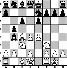 game notation in PGN-format [Event "Herbst 2016"] [Site "www.myChess.de"] [Date "2016.09.13"] [Round "1"] [White "Steffi"] [Black "Caligula"] [ECO "D20"] [WhitemyELO "1557"] [BlackmyELO "1351"] [Result "0-1"] [TimeControl "10/1728000"] [WhiteDays "00"] [BlackDays "18"] [MyChessNo "104885"] 1. d4 d5 2. c4 dxc4 3. Nc3 e6 4. e4 Bb4 5. Bxc4 c6 6. Nf3 Ne7 7. O-O b5 0-1 position notation in FEN-format rnbqk2r/p3nppp/2p1p3/1p6/1bBPP3/2N2N2/PP1P1PPP/R1BQ1RK1 - kq - 0 8 Captured white pieces: ![]() ![]() ![]() ![]() ![]() ![]() ![]() ![]() ![]() ![]() ![]() ![]() ![]() ![]() ![]() Captured black pieces: ![]() ![]() ![]() ![]() ![]() ![]() ![]() ![]() ![]() ![]() ![]() ![]() ![]() ![]() ![]() Click on a captured piece in order to display the desired move!