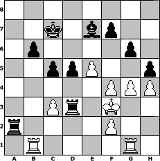 game notation in PGN-format [Event "unter uns Nr. 17"] [Site "www.myChess.de"] [Date "2014.02.13"] [Round "1"] [White "borsti"] [Black "beowulf"] [ECO "A03"] [WhitemyELO "1263"] [BlackmyELO "1350"] [Result "0-1"] [TimeControl "10/864000"] [WhiteDays "30"] [BlackDays "30"] [MyChessNo "92900"] 1. f4 d5 2. d4 e6 3. Nf3 c5 4. c3 Nc6 5. Ne5 Nxe5 6. dxe5 d4 7. e3 dxe3 8. Bxe3 b6 9. Qxd8+ Kxd8 10. Nd2 Bb7 11. O-O-O Kc7 12. Rg1 Ne7 13. Bd3 g6 14. Be4 Nd5 15. Bxd5 Bxd5 16. g3 Be7 17. Nf1 Bxa2 18. Kc2 Bd5 19. b3 a5 20. Bd2 a4 21. bxa4 Rxa4 22. Ne3 Ra2+ 23. Kd3 Rd8 24. Ke2 Bb3 25. Rb1 Rdxd2+ 26. Kf3 Bd5+ 27. Nxd5+ exd5 28. h4 h5 29. g4 Rd3# 0-1 position notation in FEN-format 8/2k1bp2/1p4p1/2ppP2p/5PPP/2Pr1K2/r4P2/1R4R1 - - - 1 30 Captured white pieces: Captured black pieces: Click on a captured piece in order to display the desired move!