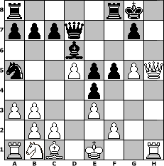 game notation in PGN-format [Event "Novemberturnier"] [Site "www.myChess.de"] [Date "2004.11.04"] [Round "1"] [White "rikilatic"] [Black "Hobbykegler"] [ECO "A01"] [WhitemyELO "1384"] [BlackmyELO "1142"] [Result "1-0"] [TimeControl "10/2592000"] [WhiteDays "60"] [BlackDays "55"] [MyChessNo "7766"] 1. b3 d5 2. d4 Nf6 3. e3 Bf5 4. Nf3 e6 5. Ne5 Bg6 6. g4 Bd6 7. Nxg6 hxg6 8. Bg2 O-O 9. g5 Ne4 10. Bxe4 dxe4 11. h4 Nc6 12. a3 e5 13. d5 Na5 14. Qe2 f6 15. Qg4 f5 16. Qh3 Qd7 17. h5 gxh5 18. Qxh5 1-0 position notation in FEN-format r4rk1/pppq2p1/3b4/n2PppPQ/4p3/PP2P3/1PP2P2/RNB1K2R - KQ - 0 18 Captured white pieces: Captured black pieces: Click on a captured piece in order to display the desired move!