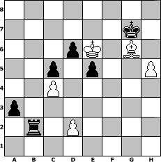 | game notation in PGN-format [Event "Winterturnier"] [Site "www.myChess.de"] [Date "2009.11.12"] [Round "1"] [White "werderfan"] [Black "Gauss1233"] [ECO "E61"] [WhitemyELO "1509"] [BlackmyELO "1389"] [Result "0-1"] [TimeControl "10/3456000"] [WhiteDays "279"] [BlackDays "270"] [MyChessNo "60557"] 1. d4 Nf6 2. c4 g6 3. Nc3 Bg7 4. Bg5 O-O 5. e3 b6 6. Nf3 Bb7 7. Be2 Ne4 8. Nxe4 Bxe4 9. O-O Qe8 10. Bd3 Bb7 11. Rc1 c5 12. Re1 d6 13. e4 f6 14. Be3 Nd7 15. e5 fxe5 16. dxe5 Bxf3 17. gxf3 Nxe5 18. Be4 Rb8 19. b3 a6 20. Bd5+ Kh8 21. f4 Nd7 22. Qc2 Nf6 23. Be6 Nh5 24. f5 Bf6 25. Bh6 Ng7 26. fxg6 Qxg6+ 27. Qxg6 hxg6 28. Bd5 Kh7 29. Bxg7 Kxg7 30. Re2 Bh4 31. f3 Kf6 32. Be6 b5 33. Bg4 Bg5 34. Re6+ Kf7 35. Rce1 Rb7 36. R1e2 bxc4 37. bxc4 Ra7 38. Kg2 a5 39. Kg3 a4 40. h4 Bf6 41. h5 g5 42. Bf5 a3 43. Bg6+ Kg7 44. Kg4 Rb7 45. Be4 Rb2 46. Bd3 Rxe2 47. Rxe2 Rb8 48. Rc2 Rb2 49. f4 gxf4 50. Kxf4 Kh6 51. Kg4 e6 52. Bg6 Rb4 53. Bf7 e5 54. Bg6 Kg7 55. Kf5 Be7 56. Ke6 Bf8 57. Rg2 Kh6 58. Kf7 Bg7 59. Bd3 Rb2 60. Rxg7 Rxa2 61. Bg6 Rb2 62. Ke6 Kxg7 0-1 position notation in FEN-format 8/6k1/3pK1B1/2p1p2P/2P5/p7/1r1P4/8 - - - 0 63 Captured white pieces:                              Captured black pieces:                               Click on a captured piece in order to display the desired move!