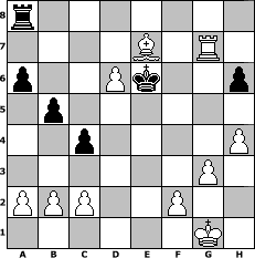 | game notation in PGN-format [Event "Zug um Zug gegen Fr"] [Site "www.myChess.de"] [Date "2010.05.04"] [Round "1"] [White "freizeitspieler"] [Black "hape50"] [ECO "D02"] [WhitemyELO "1542"] [BlackmyELO "1285"] [Result "1-0"] [TimeControl "10/2592000"] [WhiteDays "119"] [BlackDays "120"] [MyChessNo "65312"] 1. d4 d5 2. Nf3 h6 3. g3 c5 4. Bg2 c4 5. Nc3 a6 6. O-O Nf6 7. Ne5 e6 8. Re1 Bb4 9. Bd2 Bxc3 10. Bxc3 Nbd7 11. e4 O-O 12. h4 b5 13. Nc6 Qc7 14. Ne7+ Kh7 15. exd5 exd5 16. Nxd5 Nxd5 17. Bxd5 Bb7 18. Bxb7 Qxb7 19. Re7 Qd5 20. Qe2 Nf6 21. Qe5 Qf3 22. Re1 Ng4 23. Qe2 Qf5 24. Qe4 Qxe4 25. R1xe4 f5 26. R4e6 Nf6 27. d5 Kg8 28. d6 Rf7 29. Bxf6 Rxe7 30. Bxe7 Kf7 31. Re5 Ke8 32. Rxf5 Kd7 33. Rf7 Ke6 34. Rxg7 1-0 position notation in FEN-format r7/4B1R1/p2Pk2p/1p6/2p4P/6P1/PPP2P2/6K1 - - - 0 34 Captured white pieces:                              Captured black pieces:                               Click on a captured piece in order to display the desired move!