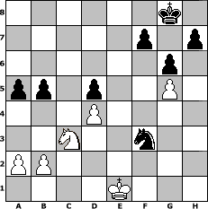 game notation in PGN-format [Event "UNTITLED CHESS TOURNAMENT"] [Site "www.myChess.de"] [Date "2019.08.19"] [Round "1"] [White "miu"] [Black "Joschi"] [ECO "B10"] [WhitemyELO "1570"] [BlackmyELO "1529"] [Result "0-1"] [TimeControl "10/2592000"] [WhiteDays "117"] [BlackDays "120"] [MyChessNo "115575"] 1. e4 c6 2. e5 d5 3. exd6 exd6 4. d4 d5 5. Bd3 Nf6 6. Ne2 Nbd7 7. Nd2 Bd6 8. Nf1 O-O 9. Nfg3 Nb6 10. Bg5 Re8 11. O-O Bg4 12. Qc1 Nbd7 13. f3 Be6 14. Re1 b5 15. Nf5 Bxf5 16. Bxf5 Qc7 17. Bf4 Bxf4 18. Qxf4 Qb6 19. Kh1 a5 20. c3 Rad8 21. Qh4 c5 22. g4 cxd4 23. cxd4 g6 24. Bxd7 Nxd7 25. g5 Re3 26. Qf2 Rde8 27. Rac1 Qd8 28. h4 Qe7 29. Rc2 Nb6 30. Kg1 Nc4 31. Kf1 Nd6 32. Rc3 Nf5 33. Rcc1 Nxh4 34. Nc3 Rxe1+ 35. Rxe1 Qxe1+ 36. Qxe1 Rxe1+ 37. Kxe1 Nxf3+ 0-1 position notation in FEN-format 6k1/5p1p/6p1/pp1p2P1/3P4/2N2n2/PP6/4K3 - - - 0 38 Captured white pieces: Captured black pieces: Click on a captured piece in order to display the desired move!