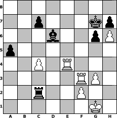 game notation in PGN-format [Event "Bremer Schl"] [Site "www.myChess.de"] [Date "2010.04.10"] [Round "1"] [White "dbuse"] [Black "HenrySchinasky"] [ECO "B04"] [WhitemyELO "2104"] [BlackmyELO "2150"] [Result "1-0"] [TimeControl "10/3456000"] [WhiteDays "161"] [BlackDays "197"] [MyChessNo "64721"] 1. e4 Nf6 2. e5 Nd5 3. d4 d6 4. Nf3 dxe5 5. Nxe5 e6 6. Bd3 Nc6 7. Nxc6 bxc6 8. O-O c5 9. dxc5 Bxc5 10. Qh5 Rb8 11. Nc3 g6 12. Qf3 O-O 13. Bh6 Nxc3 14. Bxf8 Bb7 15. Qg3 Qxf8 16. bxc3 Bd6 17. Qh4 Bd5 18. Be4 Be7 19. Qf4 Bd6 20. Qe3 Bxe4 21. Qxe4 Rb5 22. g3 Qe8 23. Rab1 Re5 24. Qd4 Ra5 25. c4 e5 26. Qe4 Qe6 27. Rfd1 Kg7 28. Rb5 Rxa2 29. Rbd5 Ra4 30. Qe2 e4 31. R1d4 f5 32. Rd1 f4 33. R5d4 f3 34. Qxe4 Qxe4 35. Rxe4 Ra2 36. h4 Rxc2 37. Rd3 a5 38. Rxf3 Ra2 39. h5 Rc2 40. h6+ 1-0 position notation in FEN-format 8/2p3kp/3b2pP/p7/2P1R3/5RP1/2r2P2/6K1 - - - 0 40 Captured white pieces: Captured black pieces: Click on a captured piece in order to display the desired move!