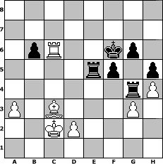 game notation in PGN-format [Event "unter uns Nr. 17"] [Site "www.myChess.de"] [Date "2014.02.13"] [Round "1"] [White "Kyros537"] [Black "Caligula"] [ECO "D00"] [WhitemyELO "1451"] [BlackmyELO "1474"] [Result "1-0"] [TimeControl "10/864000"] [WhiteDays "60"] [BlackDays "55"] [MyChessNo "92898"] 1. d4 d5 2. e3 Nf6 3. c4 c6 4. Nc3 e6 5. a3 b6 6. Nf3 Ba6 7. cxd5 Bxf1 8. Rxf1 exd5 9. Qd3 Be7 10. e4 dxe4 11. Nxe4 c5 12. Nxf6+ Bxf6 13. Qe4+ Qe7 14. Qxe7+ Bxe7 15. Be3 cxd4 16. Bxd4 O-O 17. O-O-O Nc6 18. Rfe1 Rac8 19. Kb1 h6 20. Rc1 Rfe8 21. Re4 f5 22. Re2 Kf7 23. Rd1 Rcd8 24. h4 Rf8 25. Ne5+ Nxe5 26. Rxe5 g6 27. g3 Bf6 28. f4 Bxe5 29. fxe5 Rd5 30. Rd3 Rfd8 31. e6+ Kxe6 32. Re3+ Kf7 33. Bc3 Re8 34. Rf3 Kg8 35. Rf4 Re4 36. Rf1 h5 37. Bb4 Rg4 38. Rf3 Rgd4 39. Re3 Re4 40. Rc3 Rd8 41. Rc7 a5 42. Bc3 Rd6 43. Rc8+ Kf7 44. Rc7+ Ke6 45. Rg7 Kd5 46. Kc2 Rg4 47. Be1 Ke6 48. b4 Kf6 49. Rc7 axb4 50. Bxb4 Re6 51. Bc3+ Re5 52. Rc6+ 1-0 position notation in FEN-format 8/8/1pR2kp1/4rp1p/6rP/P1B3P1/2KP4/8 - - - 4 52 Captured white pieces: Captured black pieces: Click on a captured piece in order to display the desired move!