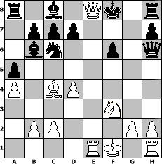 game notation in PGN-format [Event "Die letzten Sommertage!!! Teil2"] [Site "www.myChess.de"] [Date "2009.09.14"] [Round "1"] [White "espero"] [Black "Andylein1989"] [ECO "C33"] [WhitemyELO "1704"] [BlackmyELO "1537"] [Result "1-0"] [TimeControl "10/864000"] [WhiteDays "19"] [BlackDays "10"] [MyChessNo "59028"] 1. e4 e5 2. f4 exf4 3. Bc4 Qh4+ 4. Kf1 Nf6 5. Nf3 Qh6 6. Nc3 Bc5 7. d4 Bb6 8. e5 Ng8 9. a4 a5 10. Nd5 Ne7 11. Bxf4 Qg6 12. Nxe7 Kxe7 13. Bg5+ f6 14. exf6+ gxf6 15. Qe2+ Kf8 16. Re1 Nc6 17. Bh6+ Qxh6 18. Qe8+ 1-0 position notation in FEN-format r1b1Qk1r/1ppp3p/1bn2p1q/p7/P1BP4/5N2/1PP3PP/4RK1R - - - 1 18 Captured white pieces: ![]() ![]() ![]() ![]() ![]() ![]() ![]() ![]() ![]() ![]() ![]() ![]() ![]() ![]() ![]() Captured black pieces: ![]() ![]() ![]() ![]() ![]() ![]() ![]() ![]() ![]() ![]() ![]() ![]() ![]() ![]() ![]() Click on a captured piece in order to display the desired move!