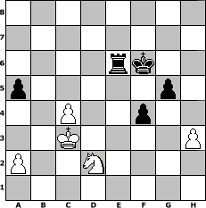 game notation in PGN-format [Event "Froms Gambit abgelehnt"] [Site "www.myChess.de"] [Date "2005.11.15"] [Round "1"] [White "reisinger"] [Black "Chelly"] [ECO "A02"] [WhitemyELO "1659"] [BlackmyELO "1711"] [Result "0-1"] [TimeControl "10/2592000"] [WhiteDays "30"] [BlackDays "30"] [MyChessNo "19646"] 1. f4 e5 2. d3 exf4 3. Bxf4 d5 4. Nf3 Nf6 5. e3 Bd6 6. Bxd6 Qxd6 7. Nc3 O-O 8. g3 Re8 9. Qd2 Bg4 10. Bg2 Nc6 11. O-O-O Ne5 12. Rhf1 c6 13. h3 Bxf3 14. Bxf3 Ng6 15. Qf2 Re7 16. e4 b6 17. exd5 Nxd5 18. Ne4 Qc7 19. Bh5 f5 20. Bxg6 hxg6 21. Nd2 Ne3 22. Rfe1 Rae8 23. Nc4 Nxd1 24. Rxe7 Qxe7 25. Kxd1 b5 26. Nd2 Qe3 27. Qxe3 Rxe3 28. Nf1 Re6 29. Kd2 a5 30. b3 Kf7 31. Nh2 g5 32. Nf3 Kf6 33. c4 bxc4 34. bxc4 c5 35. d4 cxd4 36. Nxd4 Rd6 37. Kc3 f4 38. gxf4 gxf4 39. Nf3 g5 40. Nd2 Re6 0-1 position notation in FEN-format 8/8/4rk2/p5p1/2P2p2/2K4P/P2N4/8 - - - 2 41 Captured white pieces: Captured black pieces: Click on a captured piece in order to display the desired move!