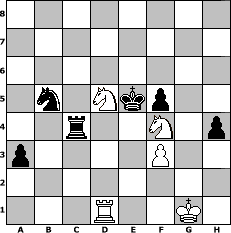game notation in PGN-format [Event "Bobby Fischer Ged"] [Site "www.myChess.de"] [Date "2008.02.01"] [Round "1"] [White "deepsabel"] [Black "HenrySchinasky"] [ECO "?"] [WhitemyELO "1779"] [BlackmyELO "1974"] [Result "1/2-1/2"] [TimeControl "10/864000"] [WhiteDays "50"] [BlackDays "46"] [MyChessNo "42179"] 1. d4 Nf6 2. c4 e6 3. Nc3 Bb4 4. e3 b6 5. Nge2 c5 6. a3 Ba5 7. Rb1 Na6 8. Bd2 O-O 9. Ng3 Bb7 10. Bd3 d5 11. cxd5 cxd4 12. exd4 Nxd5 13. b4 Naxb4 14. axb4 Nxb4 15. Be4 Bxe4 16. Ncxe4 Qxd4 17. O-O Nc6 18. Bxa5 Qxd1 19. Rfxd1 Nxa5 20. Nd6 h6 21. Nf1 Rfd8 22. Ne3 Kf8 23. Kf1 Ke7 24. Nb5 Rxd1+ 25. Rxd1 a6 26. Nd4 Rc8 27. Ke2 Nb7 28. Nec2 e5 29. Nf5+ Ke6 30. Nce3 g6 31. Nxh6 Nd6 32. f4 exf4 33. Nd5 g5 34. Nxb6 Rc2+ 35. Kf1 f5 36. Kg1 a5 37. h4 gxh4 38. Nd5 Rc4 39. Ng8 a4 40. Ngf6 a3 41. Nh5 f3 42. Nhf4+ Ke5 43. gxf3 Nb5 44. Ng6+ Ke6 45. Ngf4+ Ke5 1/2-1/2 position notation in FEN-format 8/8/8/1n1Nkp2/2r2N1p/p4P2/8/3R2K1 - - - 5 46 Captured white pieces: Captured black pieces: Click on a captured piece in order to display the desired move!