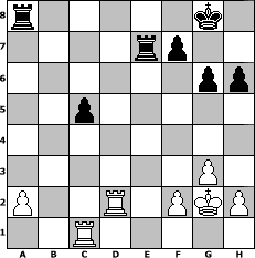 game notation in PGN-format [Event "II. Intergalaktische Meisterschaft"] [Site "www.myChess.de"] [Date "2008.09.08"] [Round "1"] [White "sprinterde"] [Black "Joschi"] [ECO "A58"] [WhitemyELO "1634"] [BlackmyELO "1525"] [Result "1/2-1/2"] [TimeControl "10/2592000"] [WhiteDays "30"] [BlackDays "30"] [MyChessNo "47837"] 1. d4 Nf6 2. c4 c5 3. d5 b5 4. cxb5 a6 5. bxa6 Bxa6 6. Nc3 d6 7. Qa4+ Nbd7 8. Qc6 g6 9. Bg5 Bg7 10. Nf3 O-O 11. g3 h6 12. Bxf6 Nxf6 13. e4 Bxf1 14. Kxf1 Qa5 15. e5 Rfc8 16. Qb5 Qxb5+ 17. Nxb5 Nxd5 18. exd6 Bxb2 19. Rd1 Nc3 20. Nxc3 Bxc3 21. dxe7 Bf6 22. Rd2 Bxe7 23. Kg2 Ra7 24. Ne5 Rca8 25. Nc6 Rc7 26. Nxe7+ Rxe7 27. Rc1 1/2-1/2 position notation in FEN-format r5k1/4rp2/6pp/2p5/8/6P1/P2R1PKP/2R5 - - - 1 27 Captured white pieces: Captured black pieces: Click on a captured piece in order to display the desired move!