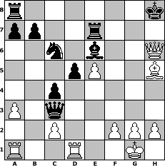 game notation in PGN-format [Event "Winawer"] [Site "www.myChess.de"] [Date "2004.02.10"] [Round "1"] [White "kalle"] [Black "Zoltan"] [ECO "C18"] [WhitemyELO "1646"] [BlackmyELO "1578"] [Result "1/2-1/2"] [TimeControl "10/2592000"] [WhiteDays "82"] [BlackDays "89"] [MyChessNo "2242"] 1. e4 e6 2. d4 d5 3. Nc3 Bb4 4. e5 c5 5. a3 Bxc3 6. bxc3 Ne7 7. Qg4 O-O 8. Nf3 Qa5 9. Bd2 c4 10. Be2 Nbc6 11. O-O f6 12. Nh4 fxe5 13. Bh6 Rf7 14. Qg3 Nf5 15. Nxf5 exf5 16. dxe5 Kh8 17. Bh5 Re7 18. Bf4 Be6 19. Rfd1 h6 20. Qe3 g5 21. Bg3 f4 22. Bxf4 gxf4 23. Qxf4 Qxc3 24. Qxh6+ Kg8 25. Qg6+ Kh8 26. Qh6+ 1/2-1/2 position notation in FEN-format r6k/pp2r3/2n1b2Q/3pP2B/2p5/P1q5/2P2PPP/R2R2K1 - - - 4 26 Captured white pieces: ![]() ![]() ![]() ![]() ![]() ![]() ![]() ![]() ![]() ![]() ![]() ![]() ![]() ![]() ![]() Captured black pieces: ![]() ![]() ![]() ![]() ![]() ![]() ![]() ![]() ![]() ![]() ![]() ![]() ![]() ![]() ![]() Click on a captured piece in order to display the desired move!