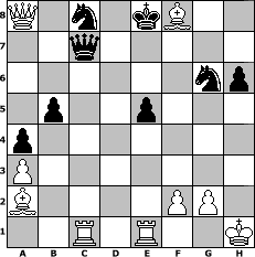 game notation in PGN-format [Event "Spa"] [Site "www.myChess.de"] [Date "2012.01.18"] [Round "1"] [White "lasker"] [Black "lotchi"] [ECO "C44"] [WhitemyELO "1326"] [BlackmyELO "1297"] [Result "1-0"] [TimeControl "10/2592000"] [WhiteDays "28"] [BlackDays "26"] [MyChessNo "79224"] 1. e4 e5 2. Nf3 Nc6 3. d4 Bb4+ 4. c3 Bd6 5. Be2 exd4 6. cxd4 f6 7. O-O g6 8. Nc3 a6 9. Re1 Bb4 10. a3 Bxc3 11. bxc3 d6 12. Bc4 b5 13. Bb3 Bg4 14. h3 Bd7 15. Qc2 Nge7 16. Bf4 a5 17. Kh1 a4 18. Ba2 g5 19. Be3 h6 20. Kg1 Ng6 21. Kh1 Nce7 22. e5 dxe5 23. dxe5 fxe5 24. c4 c6 25. cxb5 cxb5 26. Bc5 Qc7 27. Rac1 g4 28. hxg4 Bxg4 29. Qe4 Bxf3 30. Qxf3 Rf8 31. Qxa8+ Nc8 32. Bxf8 1-0 position notation in FEN-format Q1n1kB2/2q5/6np/1p2p3/p7/P7/B4PP1/2R1R2K - q - 0 32 Captured white pieces: Captured black pieces: Click on a captured piece in order to display the desired move!