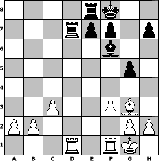 game notation in PGN-format [Event "Andys MySchach-960-Abschiedsturnier 2017"] [Site "www.myChess.de"] [Date "2017.02.18"] [Round "1"] [White "Peterlie77 (C)"] [Black "Erich"] [Variant "Fischerrandom"] [SetUp "1"] [FEN "nnbrqkrb/pppppppp/8/8/8/8/PPPPPPPP/NNBRQKRB w KQkq - 0 1"] [WhitemyELO "2148"] [BlackmyELO "2156"] [Result "1-0"] [TimeControl "10/2592000"] [WhiteDays "29"] [BlackDays "30"] [MyChessNo "107016"] 1. g4 d5 2. d4 Nc6 3. Nb3 Nb6 4. Nc3 Be6 5. Nb5 Rc8 6. Bf4 Nd8 7. Nxc7 Qc6 8. Nxe6+ Nxe6 9. Bg3 Qa4 10. Rc1 Nxd4 11. Nxd4 Qxd4 12. Qa5 g5 13. Qxa7 Rg6 14. c3 Qd2 15. O-O Qxe2 16. Qxb7 Qxg4 17. Rce1 Re8 18. Bxd5 Nxd5 19. Qxd5 Rd6 20. Qb5 Bf6 21. f3 Qd7 22. Qxd7 Rxd7 23. Rd1 1-0 position notation in FEN-format 4rk2/3rpp1p/5b2/6p1/8/2P2PB1/PP4PP/3R1RK1 - - - 1 23 Captured white pieces: Captured black pieces: Click on a captured piece in order to display the desired move!