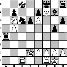 game notation in PGN-format [Event "Weinprobe 2018"] [Site "www.myChess.de"] [Date "2018.10.01"] [Round "1"] [White "kalle"] [Black "beowulf"] [ECO "B20"] [WhitemyELO "1664"] [BlackmyELO "1397"] [Result "1-0"] [TimeControl "10/1728000"] [WhiteDays "20"] [BlackDays "20"] [MyChessNo "113175"] 1. e4 c5 2. d4 cxd4 3. c3 dxc3 4. Nxc3 Nc6 5. Nf3 d6 6. Bc4 Bg4 7. Bxf7+ Kd7 8. e5 Bxf3 9. e6+ Kc8 10. Qxf3 Nf6 11. Bf4 h6 12. O-O g5 13. Be3 Bg7 14. Rac1 Ne8 15. Qd5 Nc7 16. Qd2 Qf8 17. a3 Nd8 18. Nd5 Nc6 19. b4 a6 20. Bb6 Nb5 21. a4 Nba7 22. Bxa7 Rxa7 23. b5 axb5 24. axb5 Ra4 25. Nb6+ 1-0 position notation in FEN-format 2k2q1r/1p2pBb1/1NnpP2p/1P4p1/r7/8/3QPPPP/2R2RK1 - - - 2 25 Captured white pieces: Captured black pieces: Click on a captured piece in order to display the desired move!