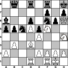 game notation in PGN-format [Event "Chess960 im M"] [Site "www.myChess.de"] [Date "2010.02.28"] [Round "1"] [White "sterpfi"] [Black "Robert"] [Variant "Fischerrandom"] [SetUp "1"] [FEN "nqbrkbnr/pppppppp/8/8/8/8/PPPPPPPP/NQBRKBNR w KQkq - 0 1"] [WhitemyELO "1489"] [BlackmyELO "1583"] [Result "1-0"] [TimeControl "10/1728000"] [WhiteDays "22"] [BlackDays "00"] [MyChessNo "63630"] 1. e4 c6 2. d4 g6 3. Nf3 Bg7 4. Bd3 a5 5. O-O Nf6 6. Bg5 b5 7. Qc1 Nb6 8. Bh6 O-O 9. Bxg7 Kxg7 10. b3 d6 11. c4 Nbd7 12. Nc2 e5 13. cxb5 cxb5 14. Ne3 Bb7 15. d5 Ba6 16. Nh4 Nc5 17. Nef5+ Kh8 18. Qh6 1-0 position notation in FEN-format 1q1r1r1k/5p1p/b2p1npQ/ppnPpN2/4P2N/1P1B4/P3PPPP/3R1RK1 - - - 6 18 Captured white pieces: Captured black pieces: Click on a captured piece in order to display the desired move!