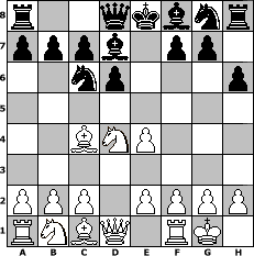 game notation in PGN-format [Event "Winter 2011/12"] [Site "www.myChess.de"] [Date "2011.12.22"] [Round "2"] [White "Baehr008"] [Black "lasker"] [ECO "C50"] [WhitemyELO "1989"] [BlackmyELO "1286"] [Result "0-1"] [TimeControl "10/2592000"] [WhiteDays "00"] [BlackDays "09"] [MyChessNo "78403"] 1. e4 e5 2. Nf3 Nc6 3. Bc4 h6 4. d4 exd4 5. O-O d6 6. Nxd4 Bd7 0-1 position notation in FEN-format r2qkbnr/pppb1pp1/2np3p/8/2BNP3/8/PPP1PPPP/RNBQ1RK1 - kq - 1 7 Captured white pieces: Captured black pieces: Click on a captured piece in order to display the desired move!
