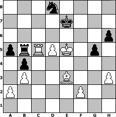 game notation in PGN-format [Event "Nach dem Weltuntergang 2012"] [Site "www.myChess.de"] [Date "2012.12.27"] [Round "1"] [White "brucybabe"] [Black "Naunhofer"] [ECO "D30"] [WhitemyELO "1647"] [BlackmyELO "1681"] [Result "1-0"] [TimeControl "10/864000"] [WhiteDays "10"] [BlackDays "10"] [MyChessNo "85704"] 1. d4 d5 2. c4 e6 3. Nf3 Nf6 4. Nc3 c6 5. e3 Nbd7 6. Bd3 Be7 7. O-O O-O 8. Re1 dxc4 9. Bxc4 b5 10. Bd3 b4 11. Ne4 a5 12. Nxf6+ Bxf6 13. Qc2 h6 14. Qxc6 Qb6 15. Be4 Ra6 16. Qxb6 Rxb6 17. Bd2 e5 18. Rac1 exd4 19. exd4 Bb7 20. Bxb7 Rxb7 21. Rc2 Rd8 22. Rec1 Nf8 23. Be3 Rbd7 24. Rc8 Ne6 25. Rxd8+ Rxd8 26. Rc4 g5 27. g4 Rd5 28. Kf1 Kg7 29. Ke2 Kg6 30. Kd3 Bg7 31. b3 f5 32. h3 Kf7 33. gxf5 Rxf5 34. Ke4 Rb5 35. d5 Nd8 36. Ne5+ Bxe5 37. Kxe5 Ke7 38. Rc5 1-0 position notation in FEN-format 3n4/4k3/7p/prRPK1p1/1p6/1P2B2P/P4P2/8 - - - 2 38 Captured white pieces: Captured black pieces: Click on a captured piece in order to display the desired move!