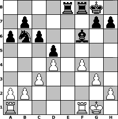 game notation in PGN-format [Event "Advents-Open 2011"] [Site "www.myChess.de"] [Date "2011.11.27"] [Round "1"] [White "ndziemba"] [Black "Naunhofer"] [ECO "A06"] [WhitemyELO "1591"] [BlackmyELO "1600"] [Result "0-1"] [TimeControl "10/864000"] [WhiteDays "10"] [BlackDays "10"] [MyChessNo "77725"] 1. Nf3 d5 2. d4 e6 3. Nc3 Nf6 4. g3 Be7 5. Bg2 O-O 6. O-O Nbd7 7. Bf4 c6 8. Qd3 a6 9. e4 dxe4 10. Nxe4 Nd5 11. Qd2 f5 12. Nfg5 Nxf4 13. Qxf4 fxe4 14. Qh4 Bxg5 15. Qxe4 Nb6 16. Bh3 Qd5 17. Qxd5 exd5 18. Bxc8 Raxc8 19. f4 Bf6 20. c3 Rce8 0-1 position notation in FEN-format 4rrk1/1p4pp/pnp2b2/3p4/3P1P2/2P3P1/PP5P/R4RK1 - - - 1 21 Captured white pieces: ![]() ![]() ![]() ![]() ![]() ![]() ![]() ![]() ![]() ![]() ![]() ![]() ![]() ![]() ![]() Captured black pieces: ![]() ![]() ![]() ![]() ![]() ![]() ![]() ![]() ![]() ![]() ![]() ![]() ![]() ![]() ![]() Click on a captured piece in order to display the desired move!