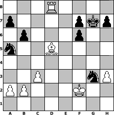 game notation in PGN-format [Event "f"] [Site "www.myChess.de"] [Date "2005.12.25"] [Round "1"] [White "MichaelKnopf"] [Black "Caligula"] [ECO "A00"] [WhitemyELO "1499"] [BlackmyELO "1273"] [Result "1/2-1/2"] [TimeControl "10/864000"] [WhiteDays "10"] [BlackDays "10"] [MyChessNo "21122"] 1. g3 d5 2. c3 e5 3. Bg2 Nf6 4. e3 c5 5. Ne2 Nc6 6. O-O Bd7 7. Qb3 Na5 8. Qd1 Be6 9. h3 Bd6 10. d4 cxd4 11. exd4 e4 12. f3 exf3 13. Rxf3 Qc7 14. Nf4 Bf5 15. Qe2+ Be4 16. Nxd5 Nxd5 17. Qxe4+ Ne7 18. Qd3 Rd8 19. d5 Bc5+ 20. Be3 Rxd5 21. Qb5+ Qc6 22. Qxc6+ Naxc6 23. Bxc5 Rxc5 24. Nd2 O-O 25. Nb3 Re5 26. Rd1 Nf5 27. Rd7 Re7 28. Rxe7 Nfxe7 29. Nc5 Na5 30. Rf4 b6 31. Nd7 Rd8 32. Rd4 Nf5 33. Nf6+ gxf6 34. Rxd8+ Kg7 35. Bd5 Nxg3 36. Kf2 1/2-1/2 position notation in FEN-format 3R4/p4pkp/1p3p2/n2B4/8/2P3nP/PP3K2/8 - - - 1 36 Captured white pieces: Captured black pieces: Click on a captured piece in order to display the desired move!