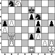 game notation in PGN-format [Event "Sommerpausen-F"] [Site "www.myChess.de"] [Date "2013.07.07"] [Round "1"] [White "reisender"] [Black "lotchi"] [ECO "B20"] [WhitemyELO "1410"] [BlackmyELO "1185"] [Result "1-0"] [TimeControl "10/2592000"] [WhiteDays "88"] [BlackDays "67"] [MyChessNo "89180"] 1. e4 c5 2. d4 d5 3. Be3 dxe4 4. c3 cxd4 5. Bxd4 Nc6 6. Bb5 Bd7 7. Nd2 f5 8. Bc5 a6 9. Bc4 Nf6 10. Ne2 e6 11. Bxf8 Kxf8 12. O-O b5 13. Bb3 a5 14. Nf4 Qe7 15. f3 g5 16. c4 gxf4 17. cxb5 Nb8 18. a4 h5 19. Nc4 Qc5+ 20. Kh1 e3 21. Rc1 Ke7 22. Re1 Rc8 23. Rc2 Qb4 24. Nb6 Ra7 25. Nxc8+ Kd8 26. Nxa7 Qxb3 27. Rc8+ Ke7 28. Qxb3 Bxc8 29. Nxc8+ 1-0 position notation in FEN-format 1nN5/4k3/4pn2/pP3p1p/P4p2/1Q2pP2/1P4PP/4R2K - - - 0 29 Captured white pieces: Captured black pieces: Click on a captured piece in order to display the desired move!