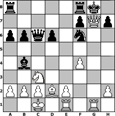 game notation in PGN-format [Event "Spass am Schach Runde 2"] [Site "www.myChess.de"] [Date "2011.07.01"] [Round "1"] [White "reisender"] [Black "gunni50"] [ECO "B20"] [WhitemyELO "1368"] [BlackmyELO "1236"] [Result "1-0"] [TimeControl "10/1728000"] [WhiteDays "20"] [BlackDays "18"] [MyChessNo "74876"] 1. e4 c5 2. d4 cxd4 3. Qxd4 Nc6 4. Qe3 e5 5. Nc3 Nf6 6. Bd2 b6 7. Bb5 Bc5 8. Qg3 O-O 9. O-O-O Bb7 10. Nf3 a6 11. Bxc6 Bxc6 12. Nxe5 Bd6 13. f4 Bxe4 14. Rde1 Bb4 15. Qe3 Bxg2 16. Rhg1 Bh3 17. Qxh3 d6 18. Nc6 Qc7 19. Qg3 Qxc6 20. Qxg7# 1-0 position notation in FEN-format r4rk1/5pQp/ppqp1n2/8/1b3P2/2N5/PPPBP2P/2K1R1R1 - - - 0 20 Captured white pieces: Captured black pieces: Click on a captured piece in order to display the desired move!