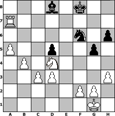 game notation in PGN-format [Event "Human Brain Turnier 2014"] [Site "www.myChess.de"] [Date "2014.06.12"] [Round "1"] [White "miu"] [Black "Caligula"] [ECO "C62"] [WhitemyELO "1599"] [BlackmyELO "1478"] [Result "1-0"] [TimeControl "10/2592000"] [WhiteDays "115"] [BlackDays "118"] [MyChessNo "94803"] 1. e4 e5 2. Nf3 Nc6 3. Bb5 d6 4. Bxc6+ bxc6 5. O-O Nf6 6. Re1 Bg4 7. d3 h6 8. c3 Rb8 9. Nbd2 d5 10. exd5 cxd5 11. Rxe5+ Be7 12. Qe1 c6 13. Nd4 Rc8 14. h3 Bd7 15. N4b3 Be6 16. Nf3 O-O 17. Nbd4 Re8 18. Nxe6 fxe6 19. Rxe6 Rc7 20. Bf4 Rb7 21. Nd4 Rc7 22. Bxc7 Qxc7 23. Nxc6 Kf8 24. Qe2 Bd6 25. Rxe8+ Nxe8 26. Nd4 Qd7 27. Re1 Nf6 28. Qe6 Qxe6 29. Rxe6 Be7 30. b4 Kf7 31. Ra6 g5 32. Rxa7 Kf8 33. a4 Bd8 34. a5 1-0 position notation in FEN-format 3b1k2/R7/5n1p/P2p2p1/1P1N4/2PP3P/5PP1/6K1 - - - 0 34 Captured white pieces: Captured black pieces: Click on a captured piece in order to display the desired move!