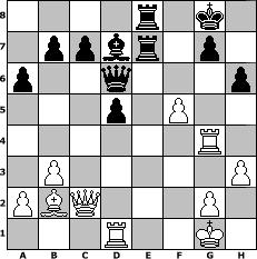 game notation in PGN-format [Event "Herbstturnier 2004"] [Site "www.myChess.de"] [Date "2004.09.02"] [Round "2"] [White "Tarot"] [Black "torsten64"] [ECO "A01"] [WhitemyELO "1889"] [BlackmyELO "1836"] [Result "1/2-1/2"] [TimeControl "10/2592000"] [WhiteDays "86"] [BlackDays "59"] [MyChessNo "6574"] 1. b3 e5 2. Bb2 Nc6 3. e3 d5 4. Bb5 Bd6 5. Nf3 Qe7 6. O-O Bd7 7. d3 a6 8. Bxc6 Bxc6 9. Nbd2 f6 10. c4 Nh6 11. h3 O-O 12. d4 e4 13. c5 Bxc5 14. dxc5 exf3 15. Nxf3 Qxc5 16. Rc1 Qd6 17. Qc2 Rac8 18. Rfd1 Rfe8 19. Rd4 Nf7 20. Rcd1 Ne5 21. Nxe5 fxe5 22. Rh4 h6 23. f4 exf4 24. exf4 Re7 25. f5 Rce8 26. Rg4 Bd7 1/2-1/2 position notation in FEN-format 4r1k1/1ppbr1p1/p2q3p/3p1P2/6R1/1P5P/PBQ3P1/3R2K1 - - - 3 27 Captured white pieces: ![]() ![]() ![]() ![]() ![]() ![]() ![]() ![]() ![]() ![]() ![]() ![]() ![]() ![]() ![]() Captured black pieces: ![]() ![]() ![]() ![]() ![]() ![]() ![]() ![]() ![]() ![]() ![]() ![]() ![]() ![]() ![]() Click on a captured piece in order to display the desired move!